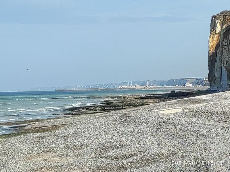 Magnifique plage par ce beau temps d'octobre. Une vue sur la plage de Dieppe et un peu plus loin, la centrale de Penly. Des dégustations d'huîtres proposées habituellement.