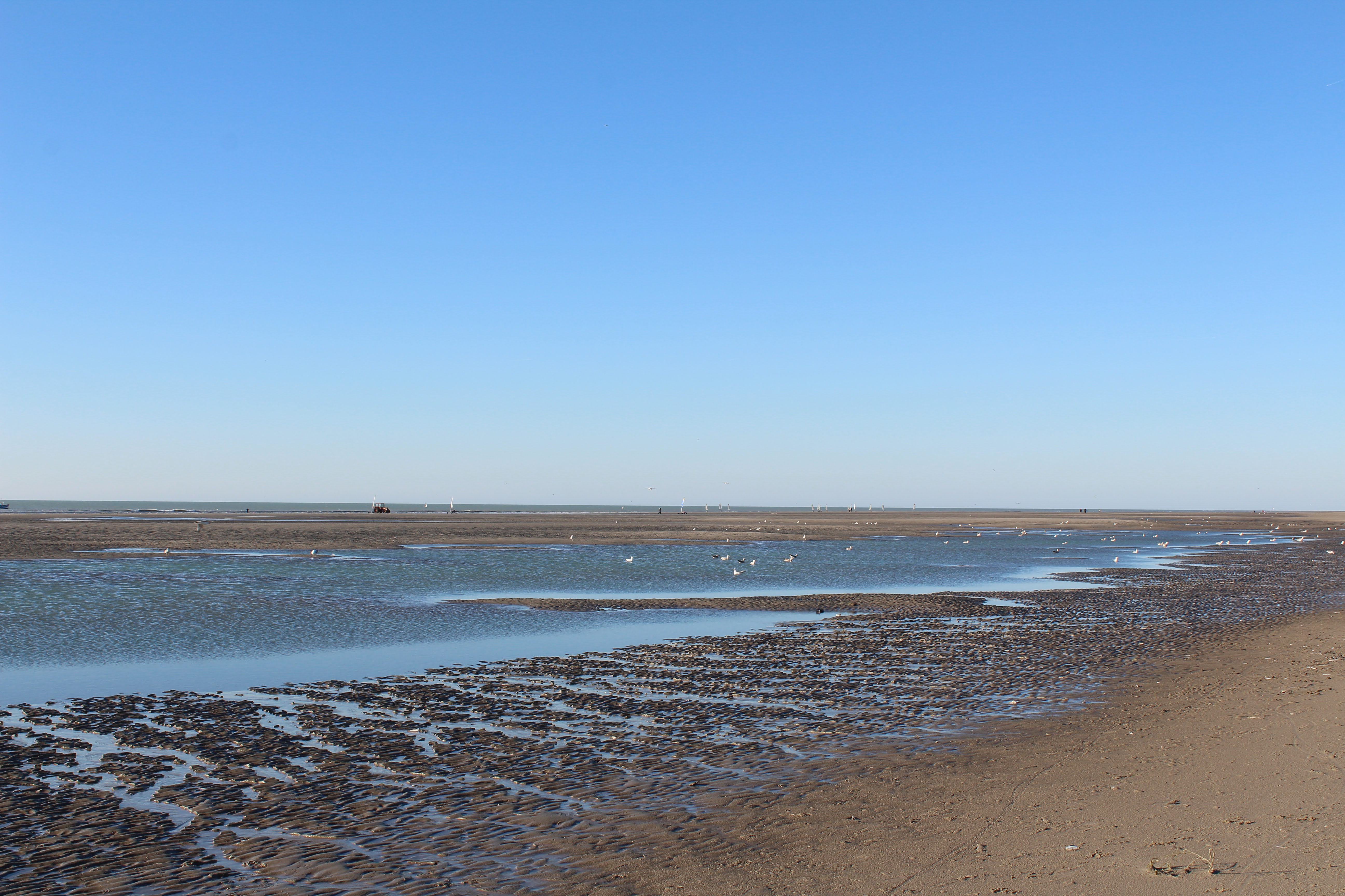Vaste plage de sable avec au loin les parcs à moule Idéal pour le char à voile et le cerf volant.