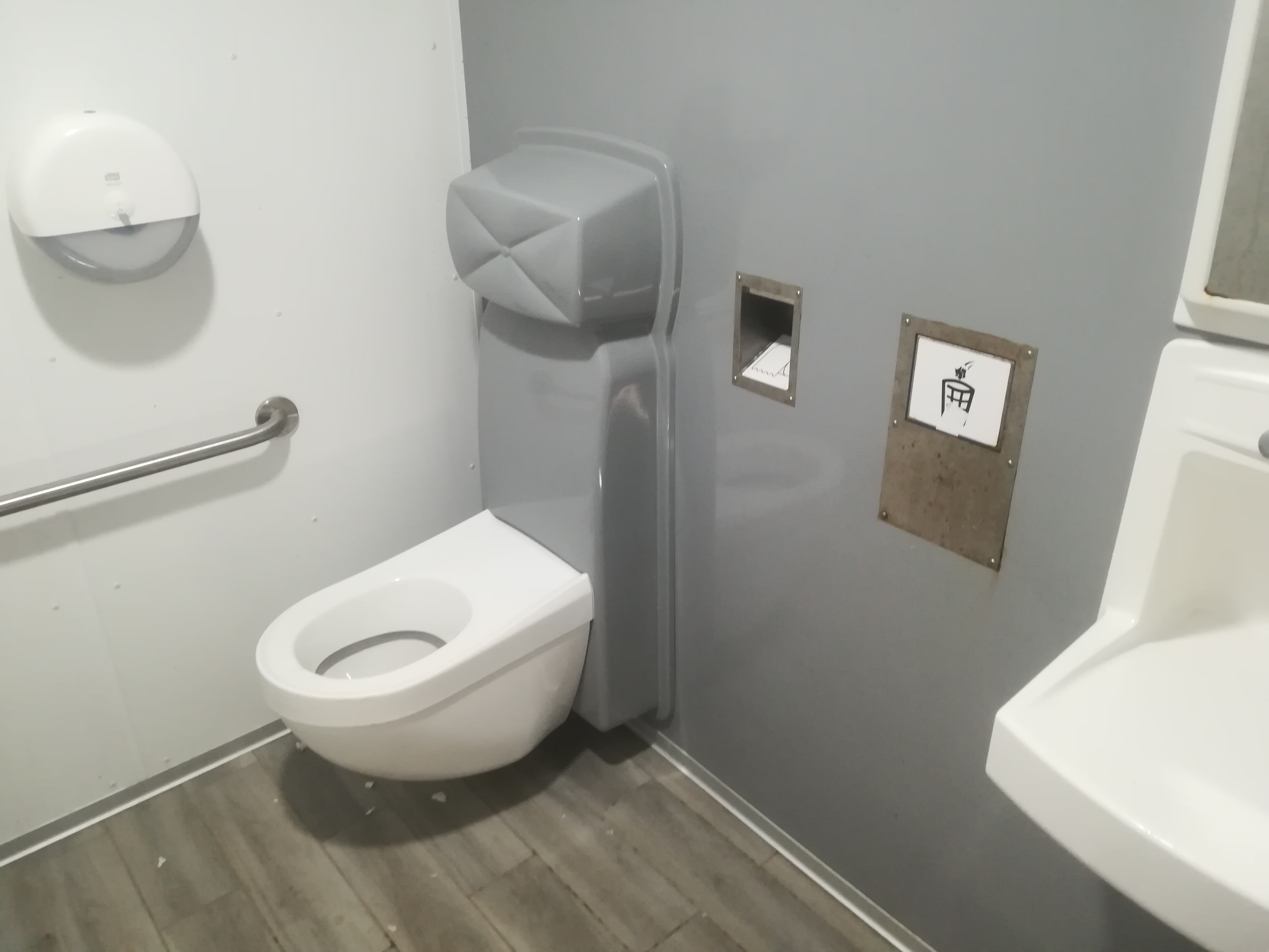 Chouette plage avec toilettes, sable fin