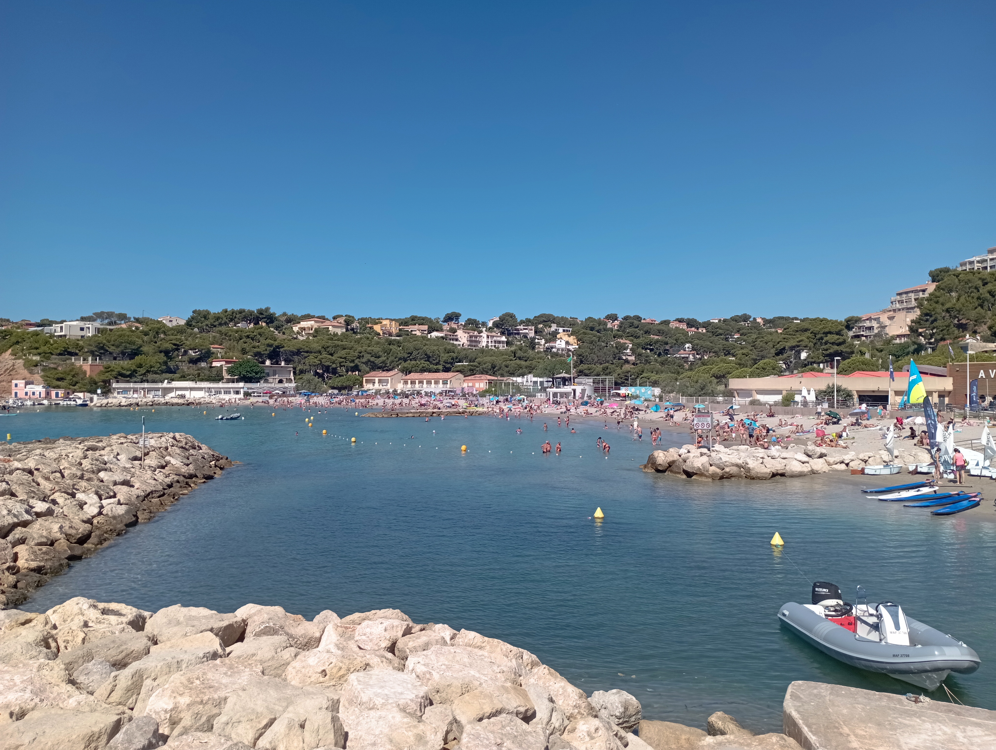 Beaucoup de monde , surtout des parents avec des enfants en bas âge car la plage est belle , le sable fin et l'eau peu profonde. Cette année la plage du Rouet est bien plus fréquentée qu'après le premier confinement. Plage tranquille , assez propre , interdite aux chiens et où la musique est interdite.